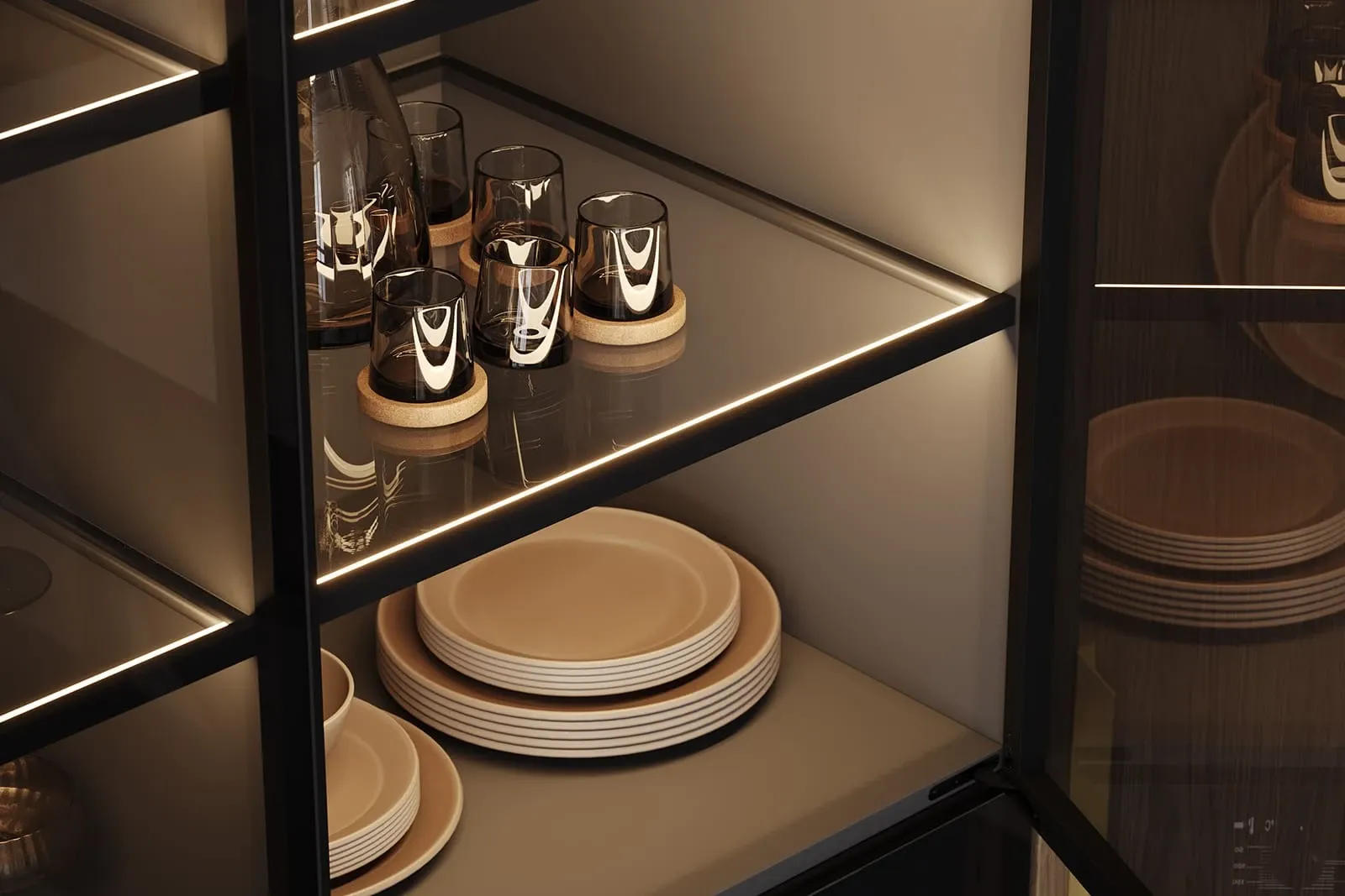 Витрины: Алюминиевый профиль А-6 Черный Матовый (скрытая петля AIR PUSH), стекло Феникс Графит