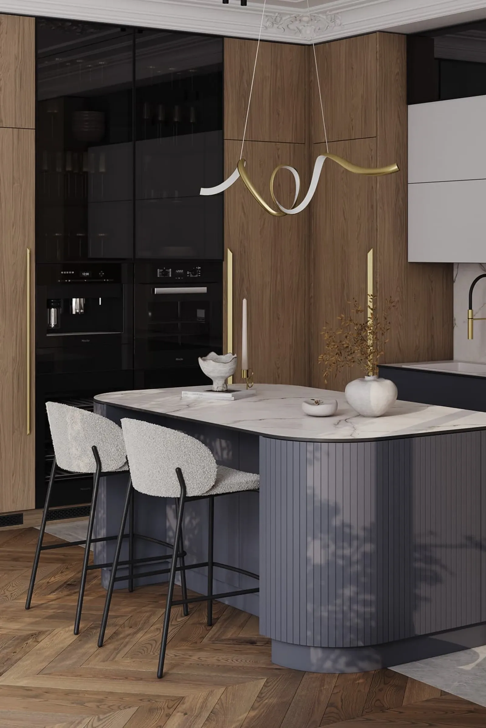 Фасады: ЛМДФ Тимбер, декор Каселла Коричневый / Аврора (крашеная МДФ), цвет NCS S 6010-R90B Матовый / крашеная МДФ, цвет NCS S 6010-R90B Матовый / NCS S 2000-N Матовый