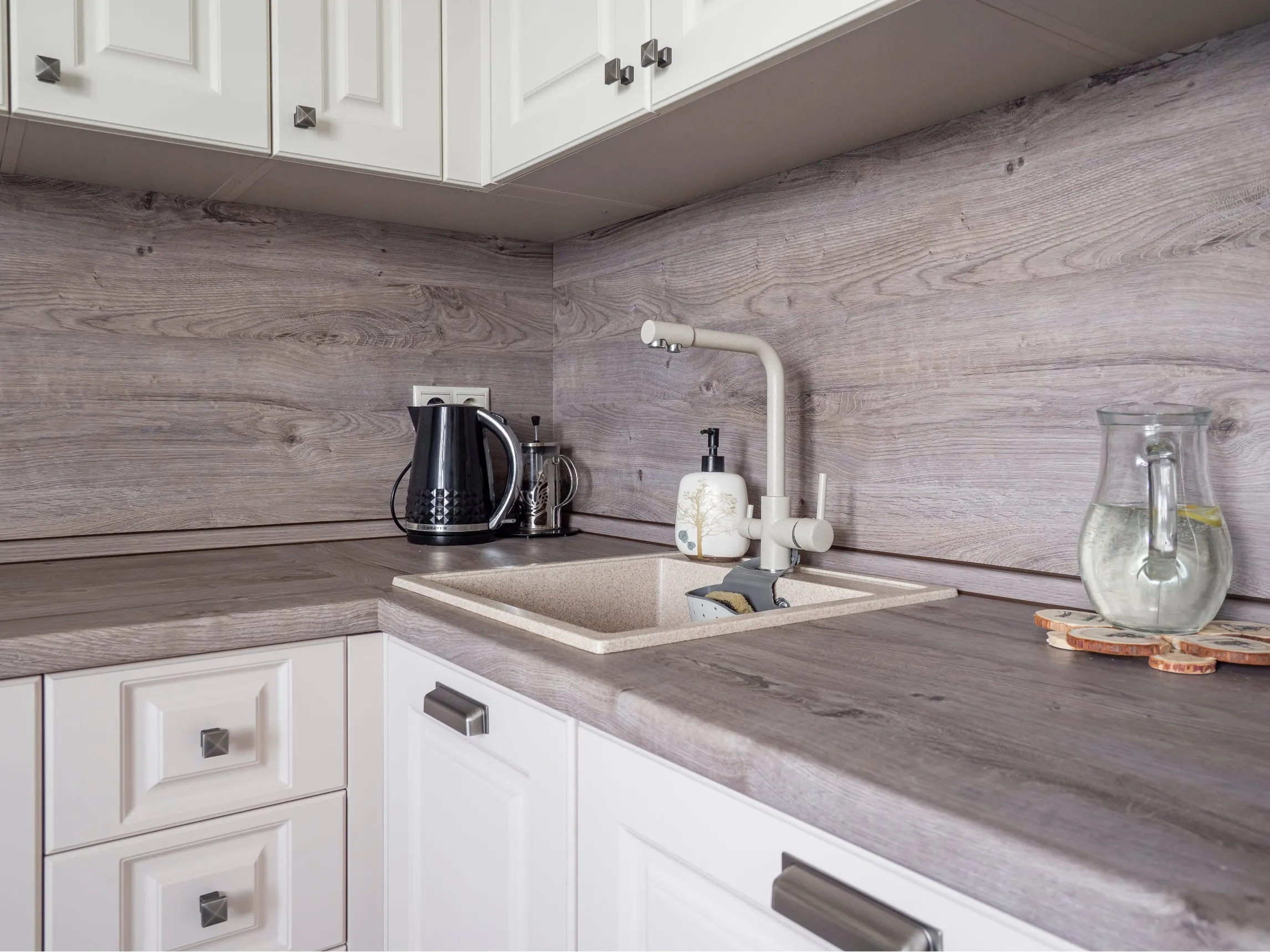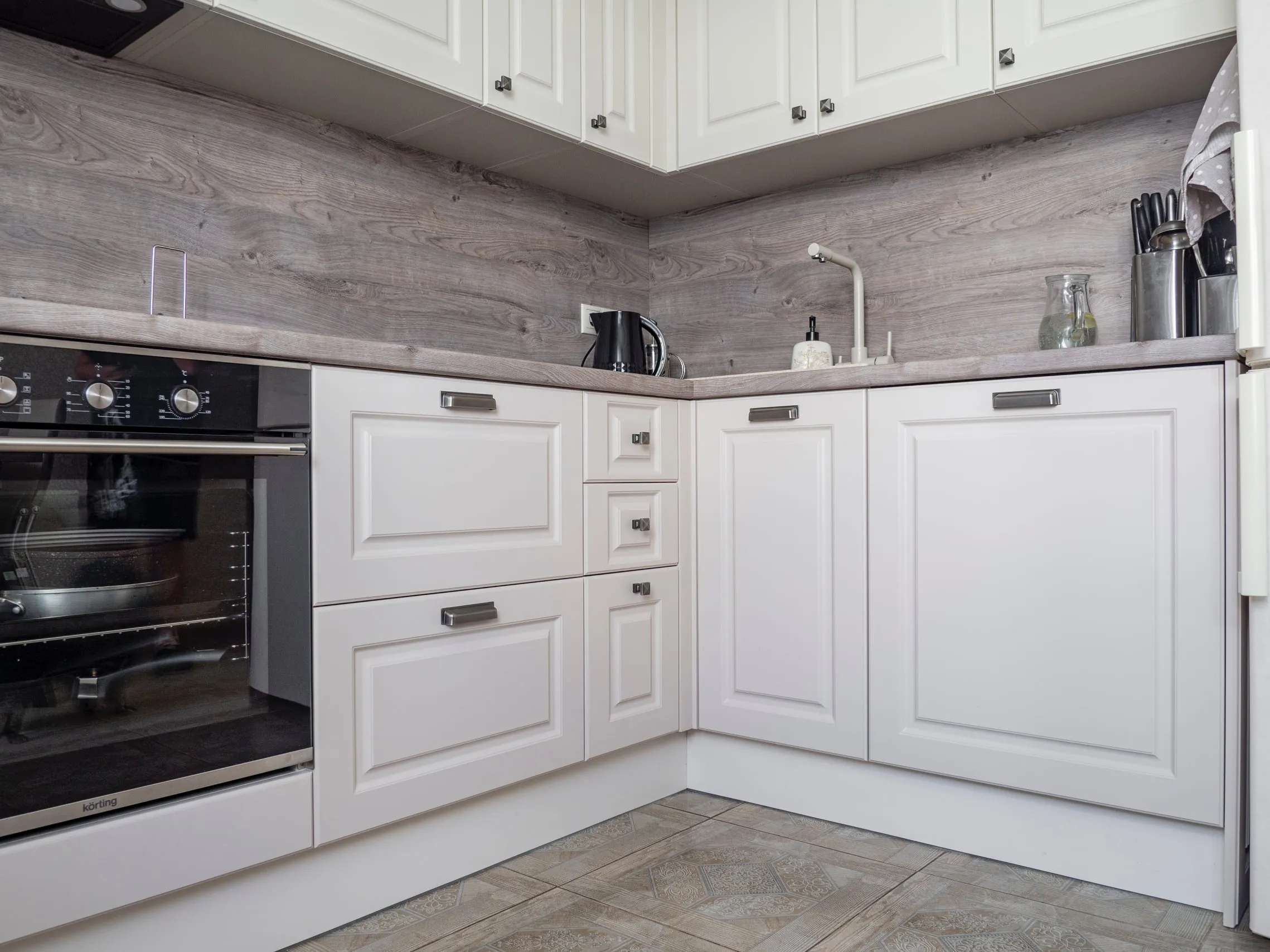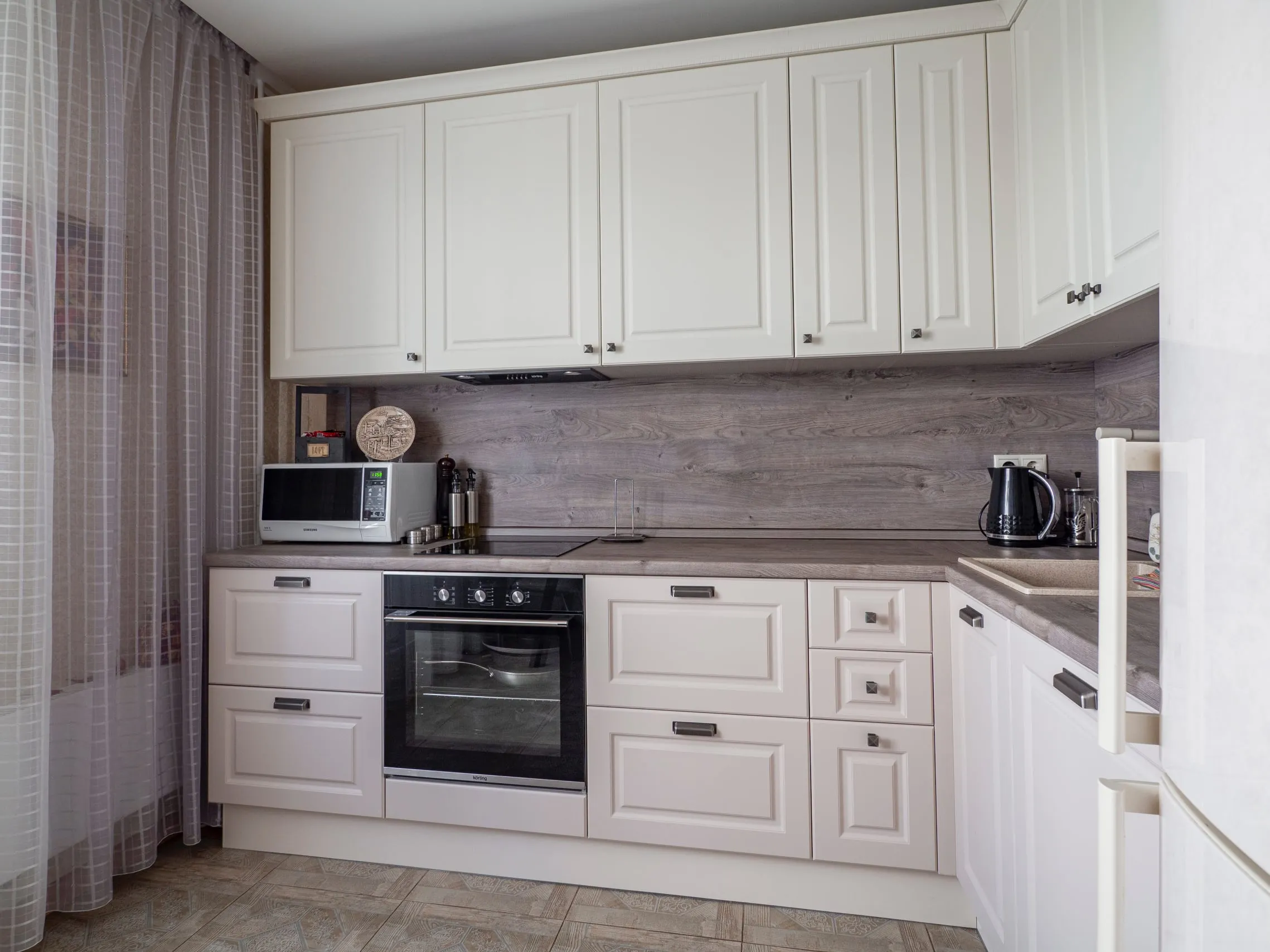 Фасады: МДФ ПВХ Лонгфорд Сатин беж; Лонгфорд Алебастр
